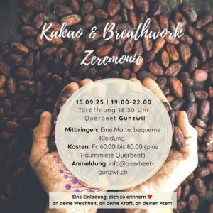 Wir laden dich herzlich zu einer besonderen Reise ein – eine Kakao Breathwork Zeremonie, die dich in die Tiefe deines Seins führt und Momente der Verbundenheit schafft.